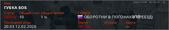 Играет на Counter Strike 1.6 сервере. Страна: РоссияПервый раз замечен 14:00 04.02.2026