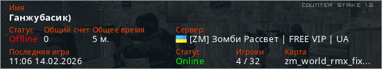 Играет на Counter Strike 1.6 сервере. Страна: УкраинаПервый раз замечен 11:01 14.02.2026