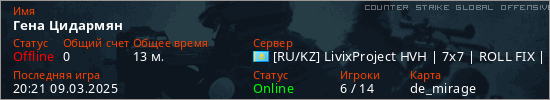 Играет на Counter Strike Global Offensive сервере. Страна: КазахстанПервый раз замечен 16:20 09.02.2025