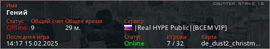 Играет на Counter Strike 1.6 сервере. Страна: РоссияПервый раз замечен 16:39 19.12.2024