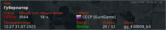 Играет на Counter Strike 1.6 сервере. Страна: РоссияПервый раз замечен 17:02 13.05.2025