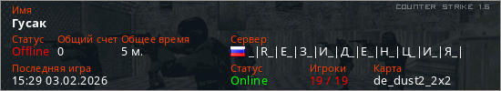 Играет на Counter Strike 1.6 сервере. Страна: РоссияПервый раз замечен 15:27 03.02.2026
