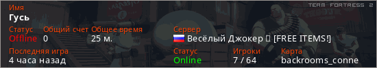 Играет на Team Fortress 2 сервере. Страна: РоссияПервый раз замечен 17:22 28.03.2026