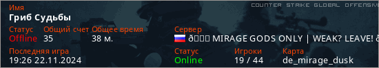 Играет на Counter Strike Global Offensive сервере. Страна: РоссияПервый раз замечен 15:15 16.11.2024