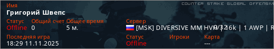 Играет на Counter Strike Global Offensive сервере. Страна: РоссияПервый раз замечен 18:25 11.11.2025