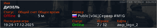 Играет на Counter Strike Source сервере. Страна: РоссияПервый раз замечен 19:27 17.12.2025