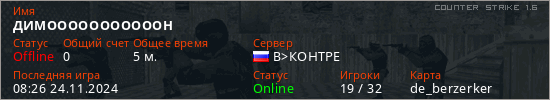 Играет на Counter Strike 1.6 сервере. Страна: РоссияПервый раз замечен 08:10 24.11.2024