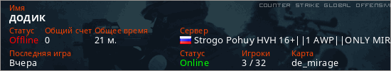 Играет на Counter Strike Global Offensive сервере. Страна: РоссияПервый раз замечен 19:45 29.11.2025
