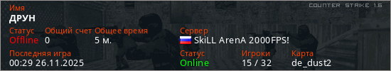 Играет на Counter Strike 1.6 сервере. Страна: РоссияПервый раз замечен 00:23 26.11.2025