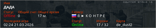 Играет на Counter Strike 1.6 сервере. Страна: РоссияПервый раз замечен 01:18 05.03.2026