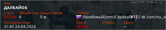 Играет на Counter Strike 1.6 сервере. Страна: РоссияПервый раз замечен 21:43 24.04.2024