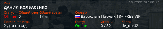 Играет на Counter Strike 1.6 сервере. Страна: РоссияПервый раз замечен 12:29 21.01.2026