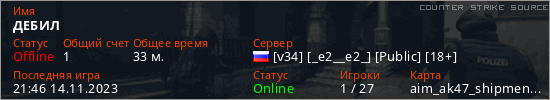 Играет на Counter Strike Source сервере. Страна: РоссияПервый раз замечен 19:00 13.11.2023