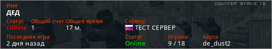 Играет на Counter Strike 1.6 сервере. Страна: РоссияПервый раз замечен 16:14 16.03.2026