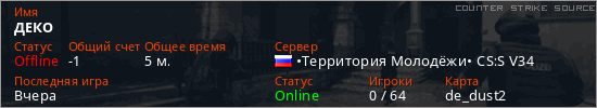 Играет на Counter Strike Source сервере. Страна: РоссияПервый раз замечен 16:28 06.02.2026
