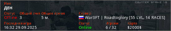Играет на Counter Strike 1.6 сервере. Страна: РоссияПервый раз замечен 16:26 29.09.2025