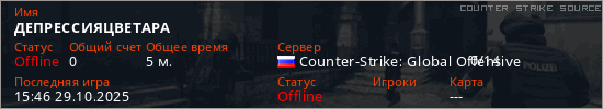 Играет на Counter Strike Source сервере. Страна: РоссияПервый раз замечен 15:18 29.10.2025