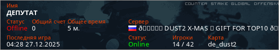 Играет на Counter Strike Global Offensive сервере. Страна: РоссияПервый раз замечен 03:58 27.12.2025