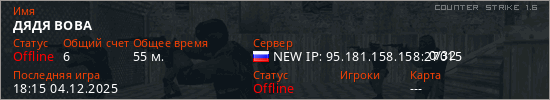 Играет на Counter Strike 1.6 сервере. Страна: РоссияПервый раз замечен 18:02 04.12.2025