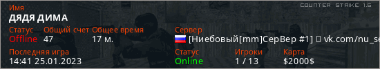 Последний раз был в сети 14:41 25.01.2023 Игрок с таким ником замечен на 2 серверах
