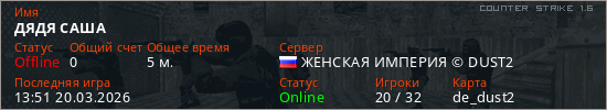 Играет на Counter Strike 1.6 сервере. Страна: РоссияПервый раз замечен 13:15 20.03.2026