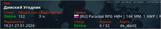Играет на Counter Strike Global Offensive сервере. Страна: РоссияПервый раз замечен 19:21 27.01.2026
