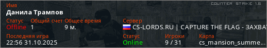 Играет на Counter Strike 1.6 сервере. Страна: РоссияПервый раз замечен 14:05 29.10.2025
