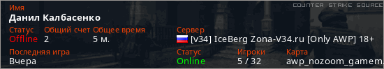 Играет на Counter Strike Source сервере. Страна: РоссияПервый раз замечен 21:43 28.12.2025