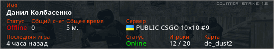 Играет на Counter Strike 1.6 сервере. Страна: УкраинаПервый раз замечен 21:10 05.03.2026