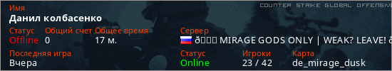 Играет на Counter Strike Global Offensive сервере. Страна: РоссияПервый раз замечен 16:11 10.01.2026