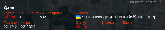 Играет на Counter Strike 1.6 сервере. Страна: УкраинаПервый раз замечен 21:55 24.02.2026