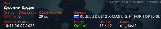Играет на Counter Strike Global Offensive сервере. Страна: РоссияПервый раз замечен 19:06 29.04.2025