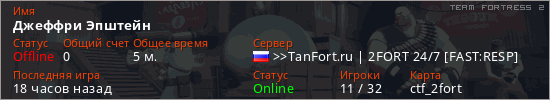 Играет на Team Fortress 2 сервере. Страна: РоссияПервый раз замечен 19:38 27.03.2026