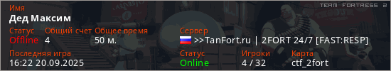 Играет на Team Fortress 2 сервере. Страна: РоссияПервый раз замечен 15:52 22.06.2025