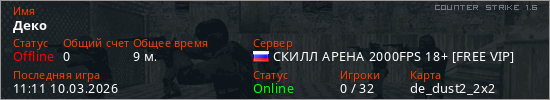 Играет на Counter Strike 1.6 сервере. Страна: РоссияПервый раз замечен 13:05 09.03.2026