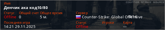 Играет на Counter Strike Source сервере. Страна: РоссияПервый раз замечен 14:16 29.11.2025