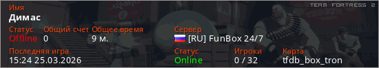Играет на Team Fortress 2 сервере. Страна: РоссияПервый раз замечен 20:23 20.03.2026
