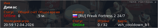 Играет на Team Fortress 2 сервере. Страна: РоссияПервый раз замечен 20:57 12.04.2026