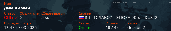 Играет на Counter Strike Global Offensive сервере. Страна: РоссияПервый раз замечен 12:15 27.03.2026