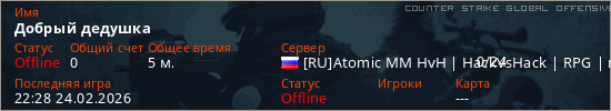 Играет на Counter Strike Global Offensive сервере. Страна: РоссияПервый раз замечен 21:34 24.02.2026