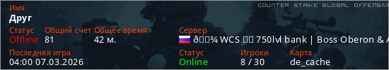 Играет на Counter Strike Global Offensive сервере. Страна: РоссияПервый раз замечен 17:00 06.03.2026