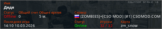 Играет на Counter Strike 1.6 сервере. Страна: РоссияПервый раз замечен 13:49 10.03.2026