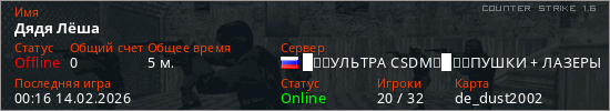 Играет на Counter Strike 1.6 сервере. Страна: РоссияПервый раз замечен 00:12 14.02.2026
