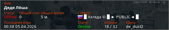 Играет на Counter Strike 1.6 сервере. Страна: РоссияПервый раз замечен 00:34 05.04.2026