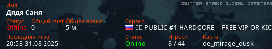 Играет на Counter Strike Global Offensive сервере. Страна: РоссияПервый раз замечен 20:06 31.08.2025