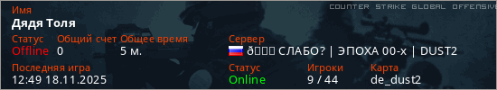 Играет на Counter Strike Global Offensive сервере. Страна: РоссияПервый раз замечен 12:38 18.11.2025
