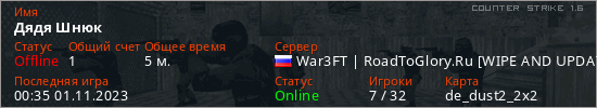 Играет на Counter Strike 1.6 сервере. Страна: РоссияПервый раз замечен 00:12 01.11.2023