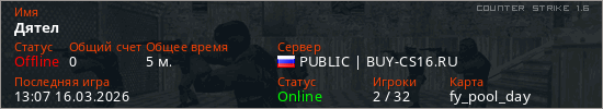 Играет на Counter Strike 1.6 сервере. Страна: РоссияПервый раз замечен 13:05 16.03.2026