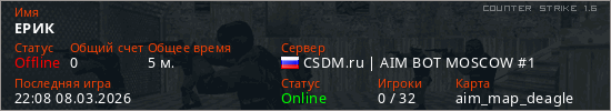 Играет на Counter Strike 1.6 сервере. Страна: РоссияПервый раз замечен 21:45 08.03.2026