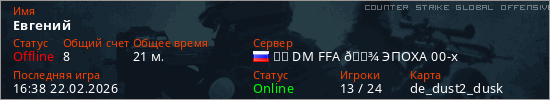 Играет на Counter Strike Global Offensive сервере. Страна: РоссияПервый раз замечен 13:43 13.02.2026